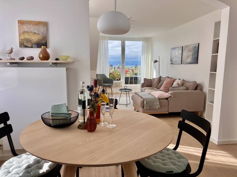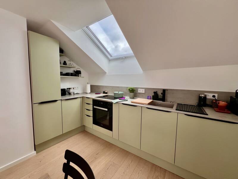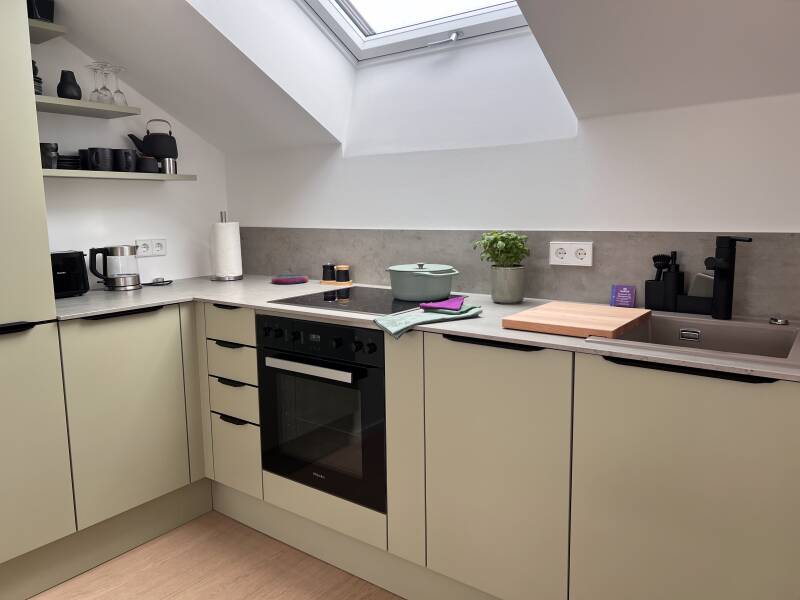 - Die Küche hat einen Miele Herd mit Backofen, einen Kühlschrank und eine Spülmaschine, ausreichendes Ess- und Kochgeschirr, Nespresso Kaffeemaschine und Milchschäumer, Toaster, Handrührgerät, Putzutensilien und einen gemütlichen Essplatz am Fenster.